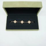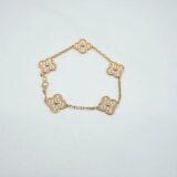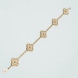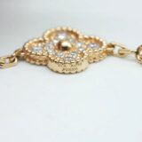 Ce bracelet Van Cleef & Arpels Vintage Alhambra en or jaune 18 carats est une pièce d’exception, intégralement sertie de 60 diamants qui enveloppent le poignet d’une brillance continue. Chaque motif « quatrefeuille » est entièrement pavé, transformant ce modèle iconique en un véritable chef-d’œuvre joaillier.