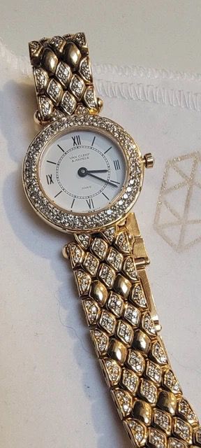 Cette montre-bracelet Van Cleef & Arpels incarne l’alliance du savoir-faire horloger et de l’excellence joaillière. Son boîtier en or jaune 18 carats de 24 mm, ceinturé d’une lunette entièrement diamantée, contraste élégamment avec son cadran noir aux chiffres romains.
